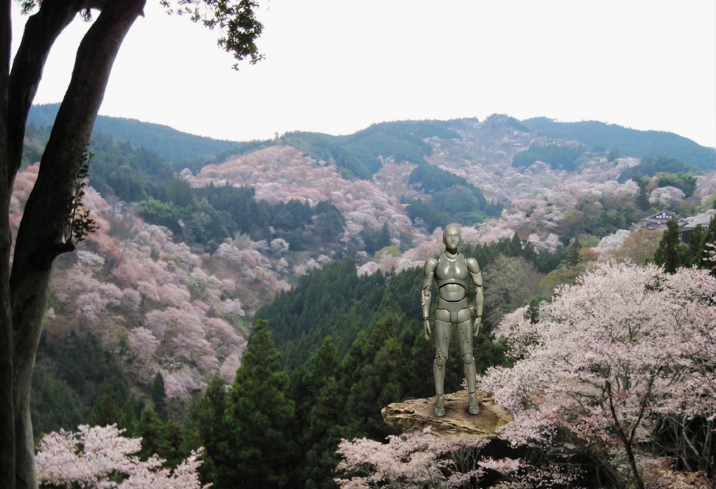 2. 理論的な計算吉野山の桜は、シロヤマザクラを中心に約3万本と言われています。この『一目千本』の画角に入っているのは、中千本から上千本にかけての主要な群生地です。結論としての推測値写真のフレーム外や、手前の大きな木に隠れている部分も含めて考えると、この一枚の景色の中にはおよそ1,000本から1,500本程度の桜が収まっていると推測するのが妥当ではないでしょうか。『一目千本』という言葉は、決して大げさな表現ではなく、計算上も『一度の視界の中に1,000本以上の個体が存在している』状態を物理的に捉えていると言えます。まさに『数える』という行為を無効化してしまうほどの圧倒的な生命力ですね。これだけの密度で桜が維持されているのは、長い歴史の中で守られてきた吉野ならではの特別な光景だと改めて感じます」